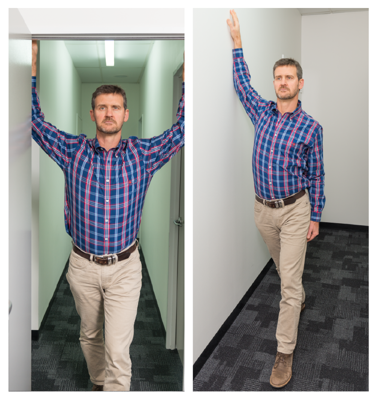The best way to reduce neck pain and headaches is to lengthen out through the front of the chest. Two important stretches are shown below. Stretches need to be long, slow and gentle to be effective. It is critical NOT to stretch any of the overloaded muscles on the back of our neck and shoulders, (although this can feel good in the moment, it worsens the underlying muscle imbalance and increases the likelihood of pain). Another important thing to do is to sit well at your desk.